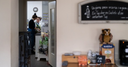 In sala da pranzo, un vegetariano chiede un uovo con il suo riso. E la cucina è felice di accontentarlo. Gli chef sono responsabili della pianificazione del menù. Insieme compongono un menù di quattro portate in base al cibo che ricevono, la maggior parte del quale proviene dalla Fondazione Schweizer Tafel e da altri donatori.