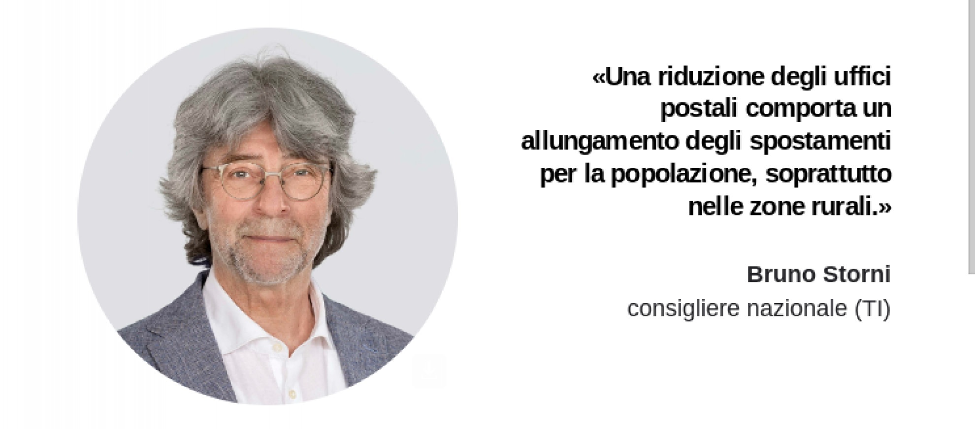 «La Posta Svizzera si trova in una buona situazione finanziaria: con anni di utili milionari a tre cifre, un'attività di spedizione pacchi in piena espansione e forti guadagni per PostFinance. Non c'è quindi motivo di ridurre la presenza della Posta», rincara la dose il Consigliere nazionale Bruno Storni. «Una riduzione degli uffici postali comporta un allungamento degli spostamenti per la popolazione, soprattutto nelle zone rurali».