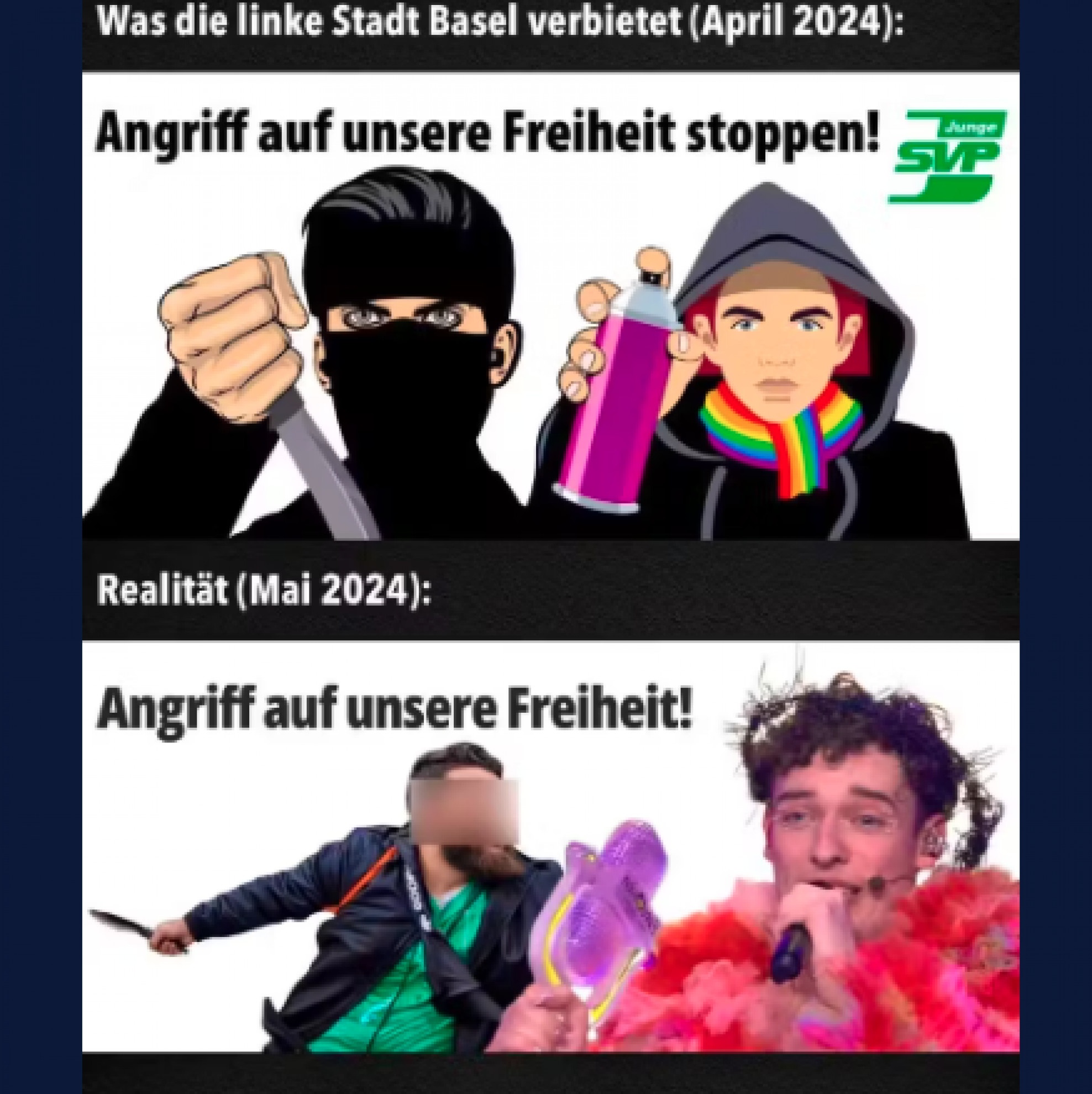 BERNA - Un accostamento che ha immediatamente fatto esplodere le polemiche. È quello realizzato dai Giovani dell'UDC che in un manifesto hanno messo insieme l'afghano di 25 anni, che ha attaccato con un coltello un gruppo di persone (uccidendo un poliziotto) a un raduno di estremisti di destra a Mannheim in Germania e Nemo, il vincitore dell'Eurovision Song Contest.
