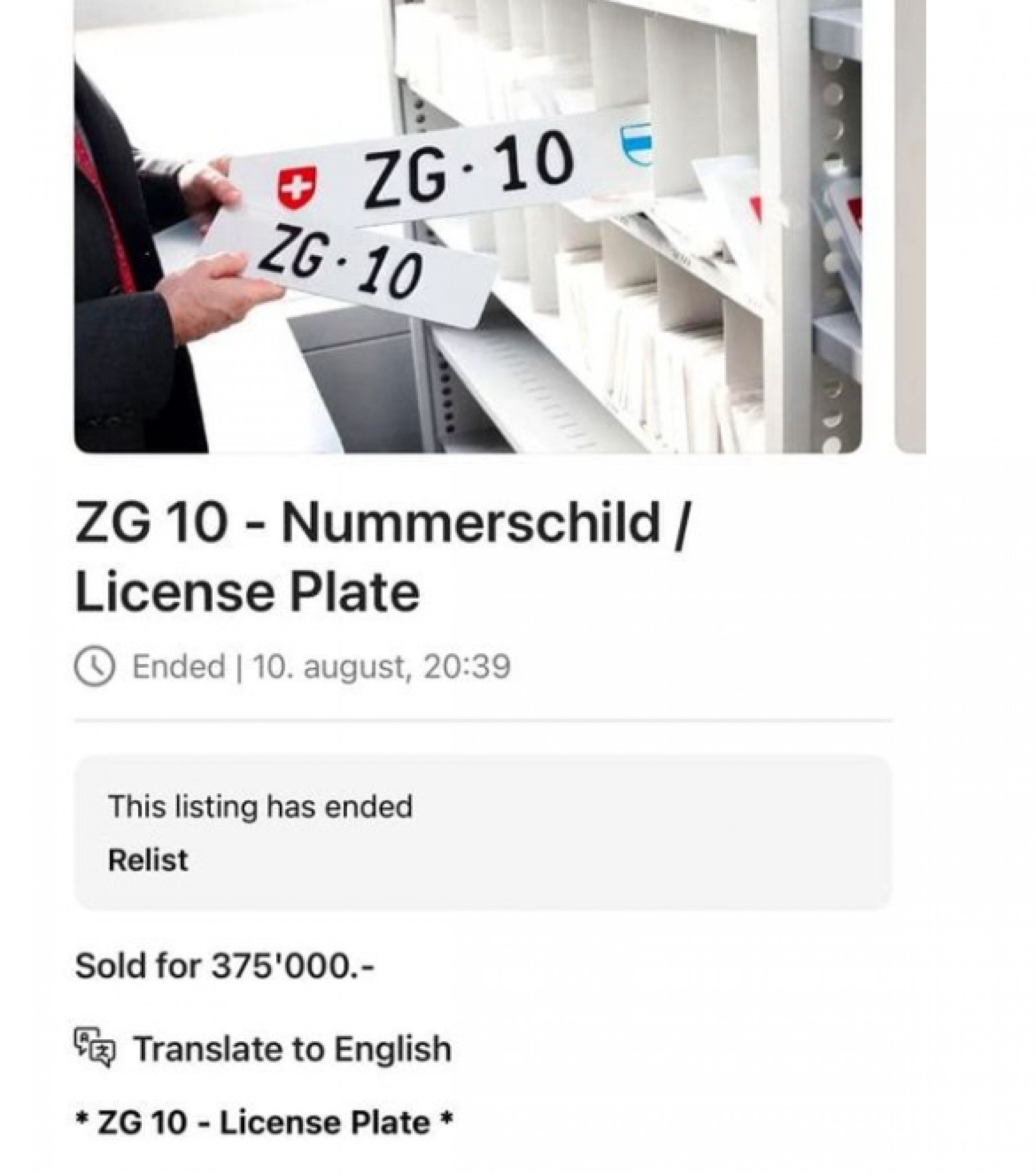 Insomma, tutto da rifare. Vista la cifra elevata e le poche recensioni relative al milionario, presenti sull'asta online, sembra che Ricardo abbia chiesto maggiori certezze circa l'effettiva proprietà della "ZG 10". Tutto appianato domenica, quando le due parti si sono definitivamente chiarite. Anche se, come spiegato al Blick direttamente da Ricardo, «la vendita della targa per 375mila franchi è fallita perché l'acquirente si è ritirato dall'acquisto». Una divergenza di vedute tra le parti che però si è appianata dal momento che la "ZG 10" è stata messa all'asta oggi pomeriggio e lo sarà fino al 20 di agosto, salvo che un acquirente si decida a sborsare, in un colpo, la cifra di 399mila CHF.