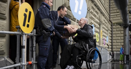 Per consentire alle persone in sedia a rotelle di prendere parte alla consegna, sul retro di Palazzo federale è stata posata una rampa provvisoria. Le firme sono state quindi consegnate alle 15.45.