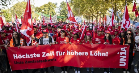Riuniti sotto la parola d'ordine "È ora di aumentare i salari", i partecipanti alla manifestazione nazionale hanno sfilato dalla stazione di Berna fino alla Piazza federale, scandendo slogan come "Più salari, meno bonus". Il corteo si è svolto senza incidenti, ha constatato una giornalista di Keystone-ATS sul posto.