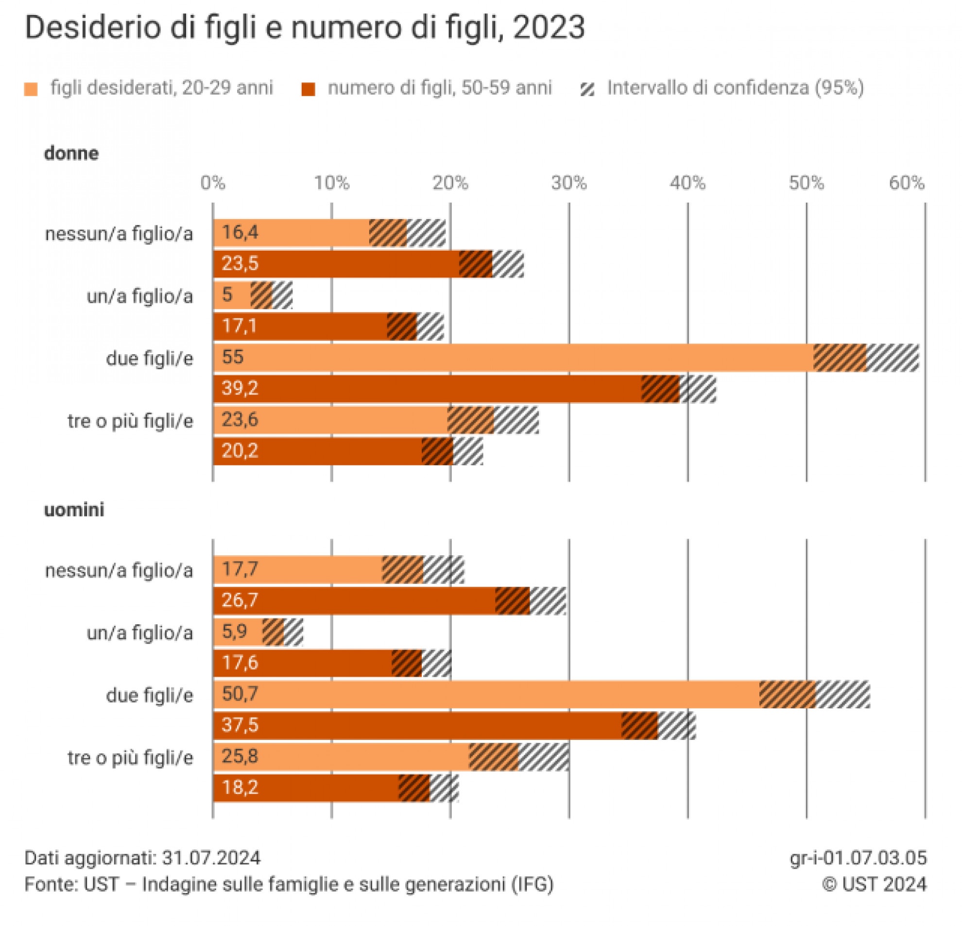 NEUCHÂTEL - La maggior parte dei giovani svizzeri vuole avere ancora figli, per l'esattezza almeno due. È quanto emerge dai primi risultati dell'indagine sulle famiglie e sulle generazioni 2023 realizzata dall'Ufficio federale di statistica, diffuso questa mattina. Stando allo studio, il 53% delle oltre 18mila persone intervistate dai 20 ai 29 anni vorrebbe avere due figli. Il 25% desidererebbe avere tre figli o più e il 5% uno solo. Quasi una persona su cinque non ne vuole (17%). Al di là dei desideri, tuttavia, la realtà che ne deriva è diversa: mettendo a confronto persone di altre fasce di età, solo il 38% di quelle dai 50 ai 59 anni ha due figli, il 19% ne ha tre o più e il 17% uno solo. Una persona su quattro non ha figli (25%).