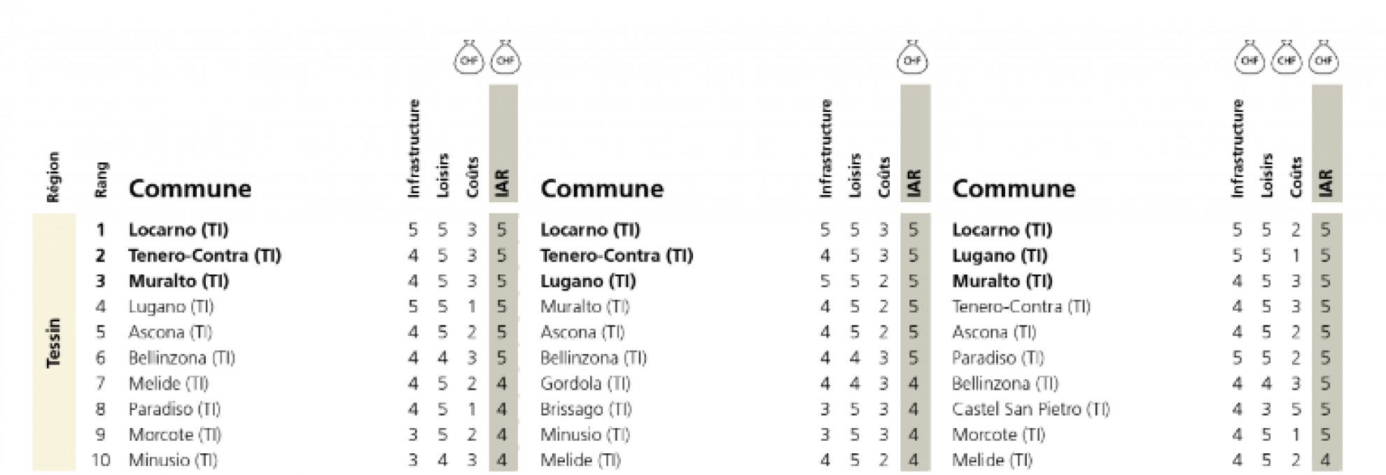 UbsLe top 10, da sinistra verso destra: redditi medi, redditi bassi e redditi alti. I fattori presi in cosiderazione: Infrastrutture, Svaghi e Costi.