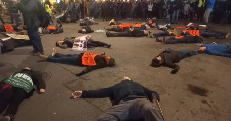 Diverse persone si sono sdraiate in terra (come dimostrano le foto inviate in redazione da un lettore di Tio) in segno di protesta contro le politiche ambientali del governo, da quelle sulle emissioni alla cementificazione e ai progetti di ampliamento delle autostrade.