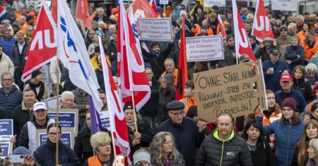Un migliaio di persone hanno manifestato davanti all'acciaieria confrontata da gravi difficoltà finanziarie.