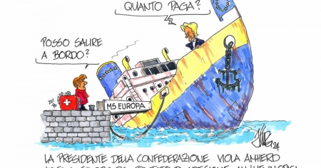 BERNA - Viola Amherd, la Presidente della Confederazione con una valigia piena di soldi sul molo (la Svizzera) che chiede di salire su una nave che sta affondando (l’Unione europea). È con questa vignetta che l’UDC ha accolto oggi l’arrivo a Berna della presidente della Commissione europea, Ursula Von Der Leyen, che ha incontrato la presidente della Confederazione per concludere i negoziati tra Svizzera e Unione europea.