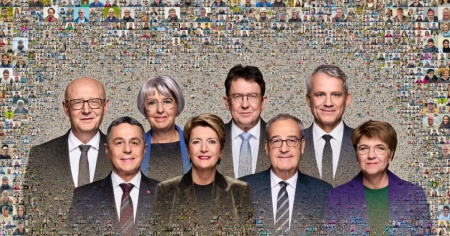 Oltre 1000 immagini di cittadini unite in un mosaico, a fare da sfondo ai ritratti dei sette consiglieri federali e del cancelliere della Confederazione. È la foto ufficiale del governo per il 2025, realizzata da Arthur Gamsa.