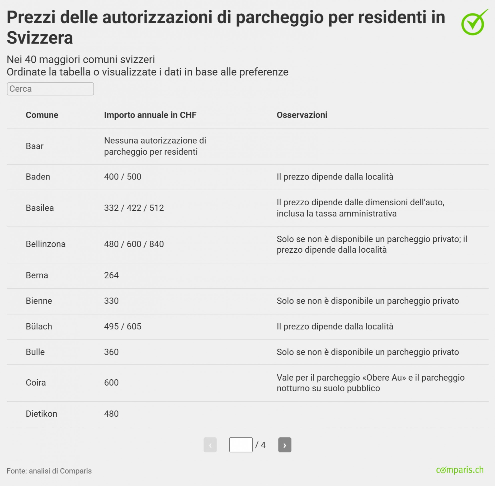 ZURIGO - In Svizzera vi sono fortissime differenze di prezzo in relazione ai permessi annuali di posteggio su suolo pubblico destinati ai residenti: lo spettro va dai 20 franchi di La Chaux-de-Fonds (NE) ai 960 franchi di Wetzikon (ZH), passando dai 480 franchi di Lugano e dai 480/600/840 (a seconda della località) di Bellinzona, emerge da un'analisi effettuata dal servizio di confronti Comparis sui 40 più popolosi comuni elvetici. «Come per molti altri settori, la Svizzera è molto disomogenea anche per quanto riguarda le autorizzazioni di parcheggio. Questo si riflette sia nelle tariffe, che presentano differenze enormi tra loro, che nelle diverse linee guida per l’assegnazione delle autorizzazioni di parcheggio ai residenti», afferma Adi Kolecic, esperto Comparis in mobilità. Inoltre, c’è un’evidente tendenza al rincaro di questi permessi, che grava ulteriormente sul bilancio di molti proprietari di auto nelle città.