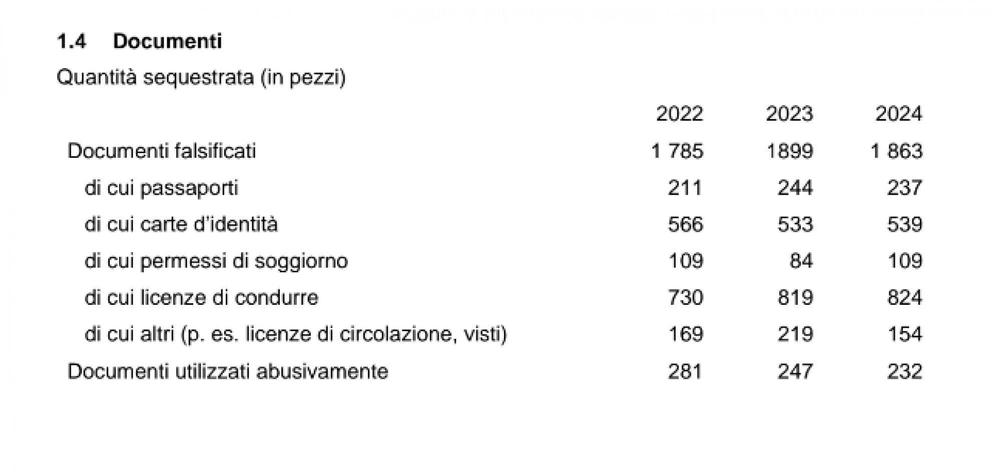 I dati dell'UDSC - Nel 2024, secondo i dati dell’Ufficio federale della dogana e della sicurezza dei confini (UDSC), sono stati 1863 i documenti falsificati intercettati in dogana. Di questi, 237 erano passaporti, 539 carte d’identità, 109 permessi di soggiorno.
