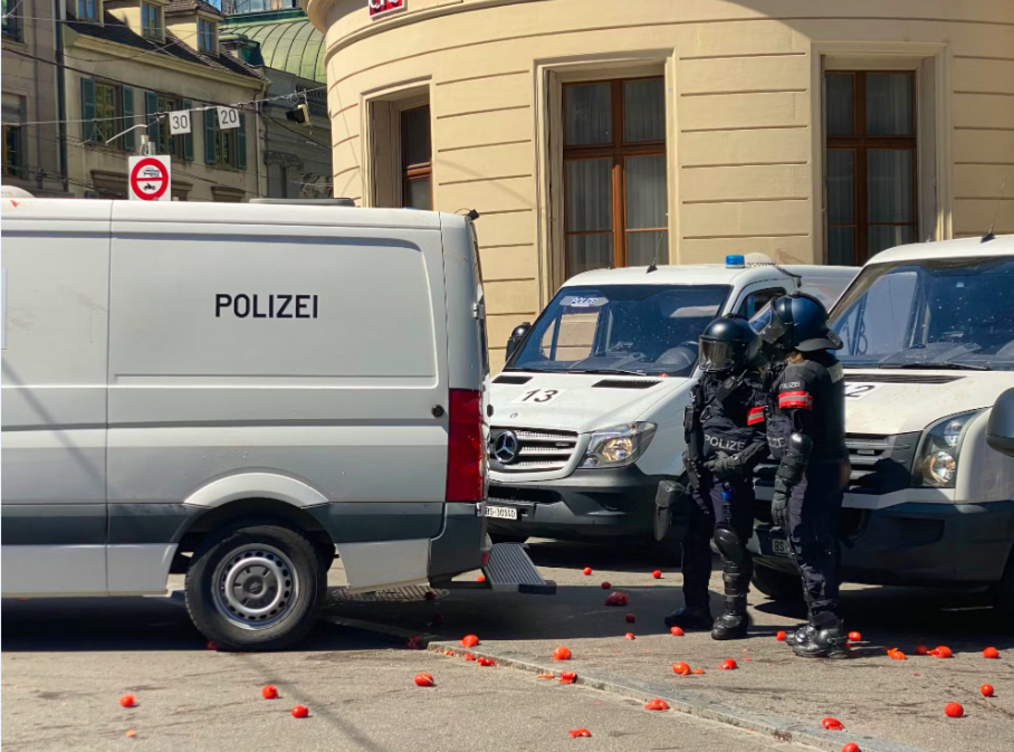 Il lancio dei pomodori - A Basilea, nel corso della manifestazione sono stati lanciati pomodori contro le forze dell'ordine. La polizia ha però informato che è stata in gran parte pacifica. Stando a quanto riferito, si stima che circa 2.500 partecipanti abbiano marciato lungo il percorso approvato. In alcuni casi i manifestanti hanno imbrattato auto e vetrine di negozi.