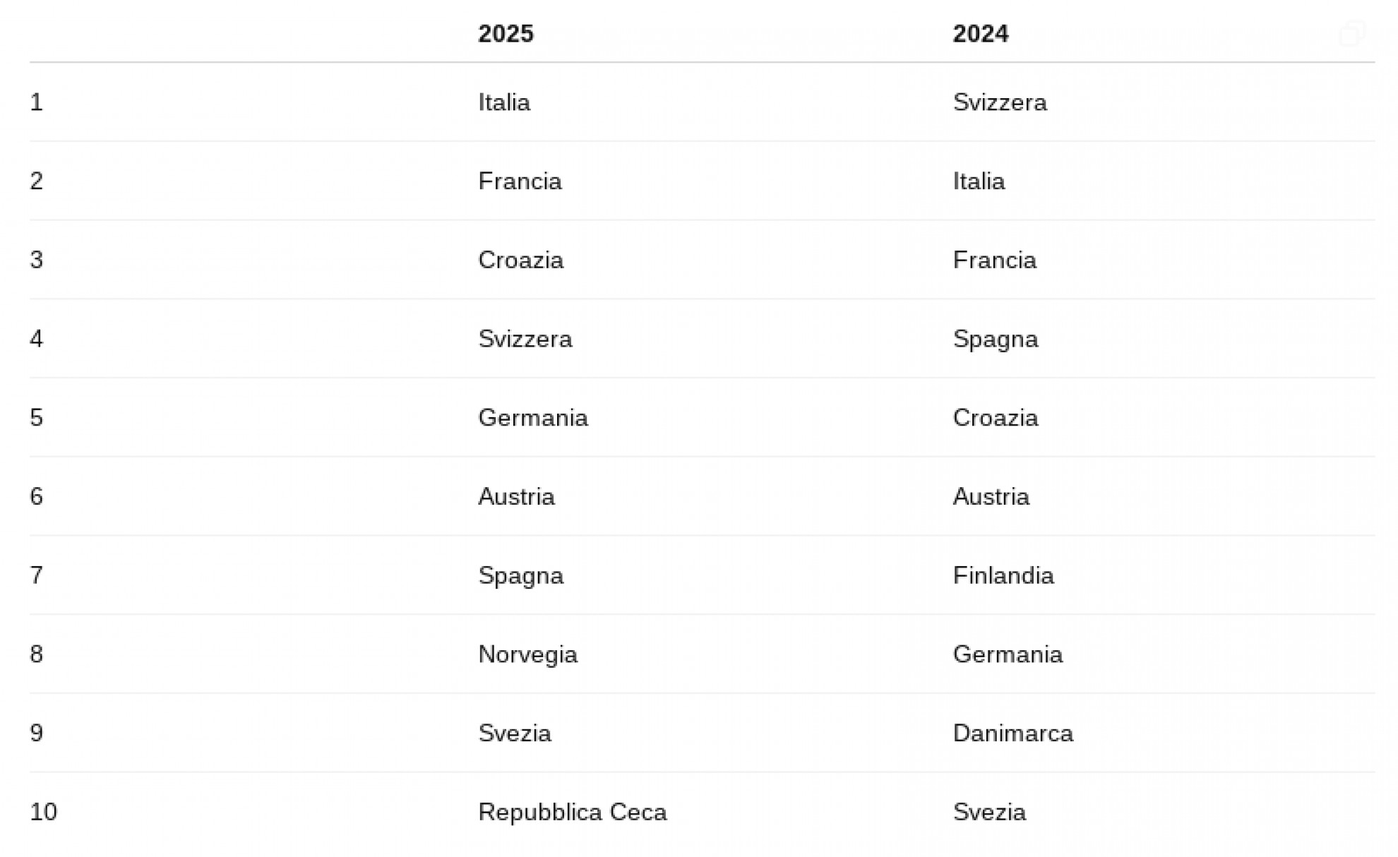 A perdere terreno sono invece la Svizzera, che nel 2024 era al primo posto, e la Spagna, che scivola di tre posizioni.