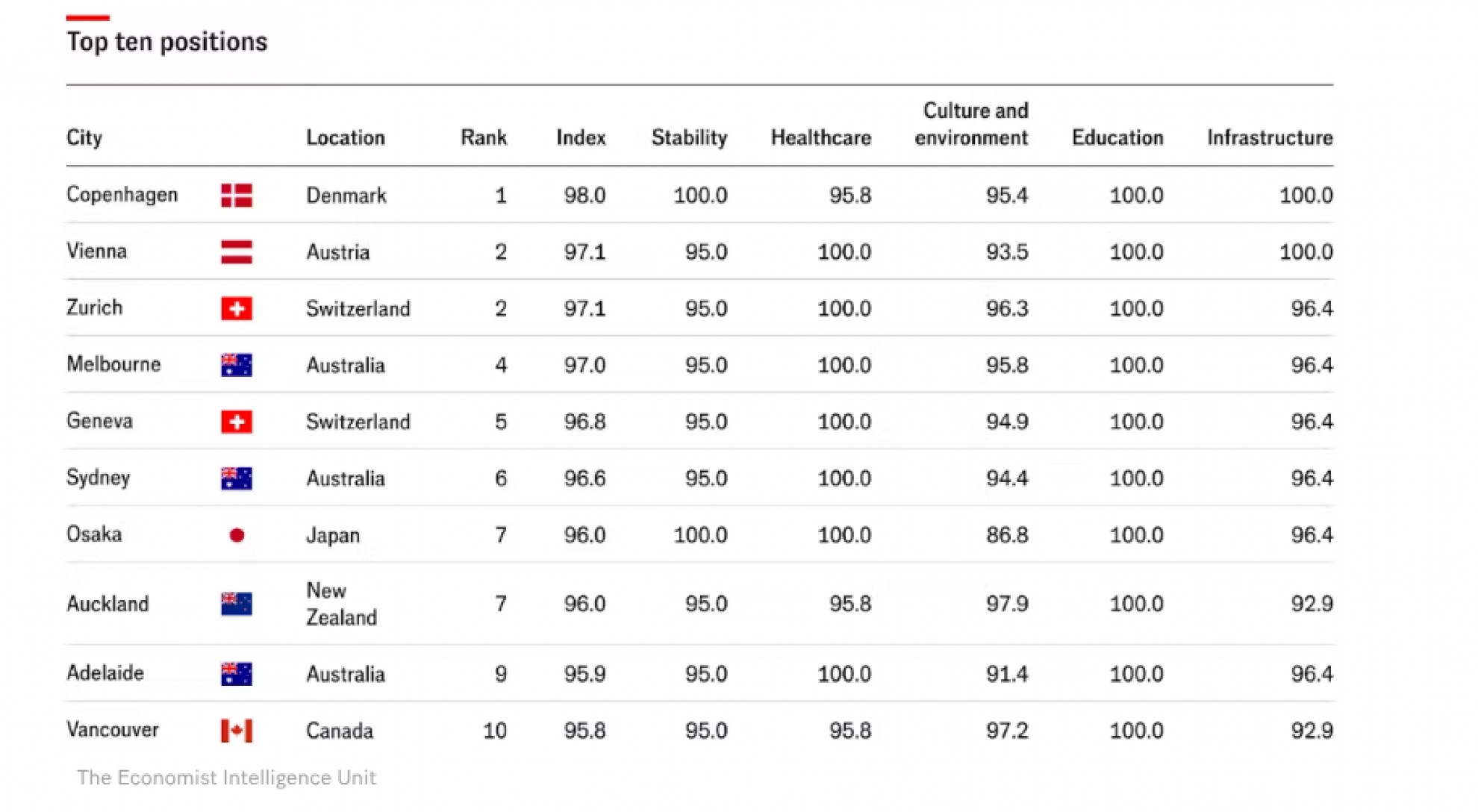 Da Copenaghen a Damasco - Oltre alle capitali di Danimarca e Austria e alle due città elvetiche, nella top ten della classifica troviamo tre metropoli australiane (Melbourne, Syndey e Adelaide), la giapponese Osaka, la neozelandese Auckland e la canadese Vancouver. In fondo alla classifica troviamo all'ultimo posto Damasco (Siria). Non fanno molto meglio diverse capitali africane come Tripoli (Libia), Algeri (Algeria), Harare (Zimbabwe), Lagos (Nigeria)o megalopoli del sud-est asiatico come Dacca (Bangladesh) e Karachi (Pakistan) o Port Moresby (Papua Nuova Guinea) e Caracas (Venezuela).