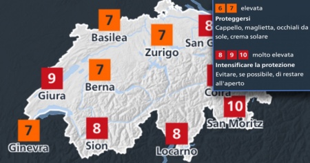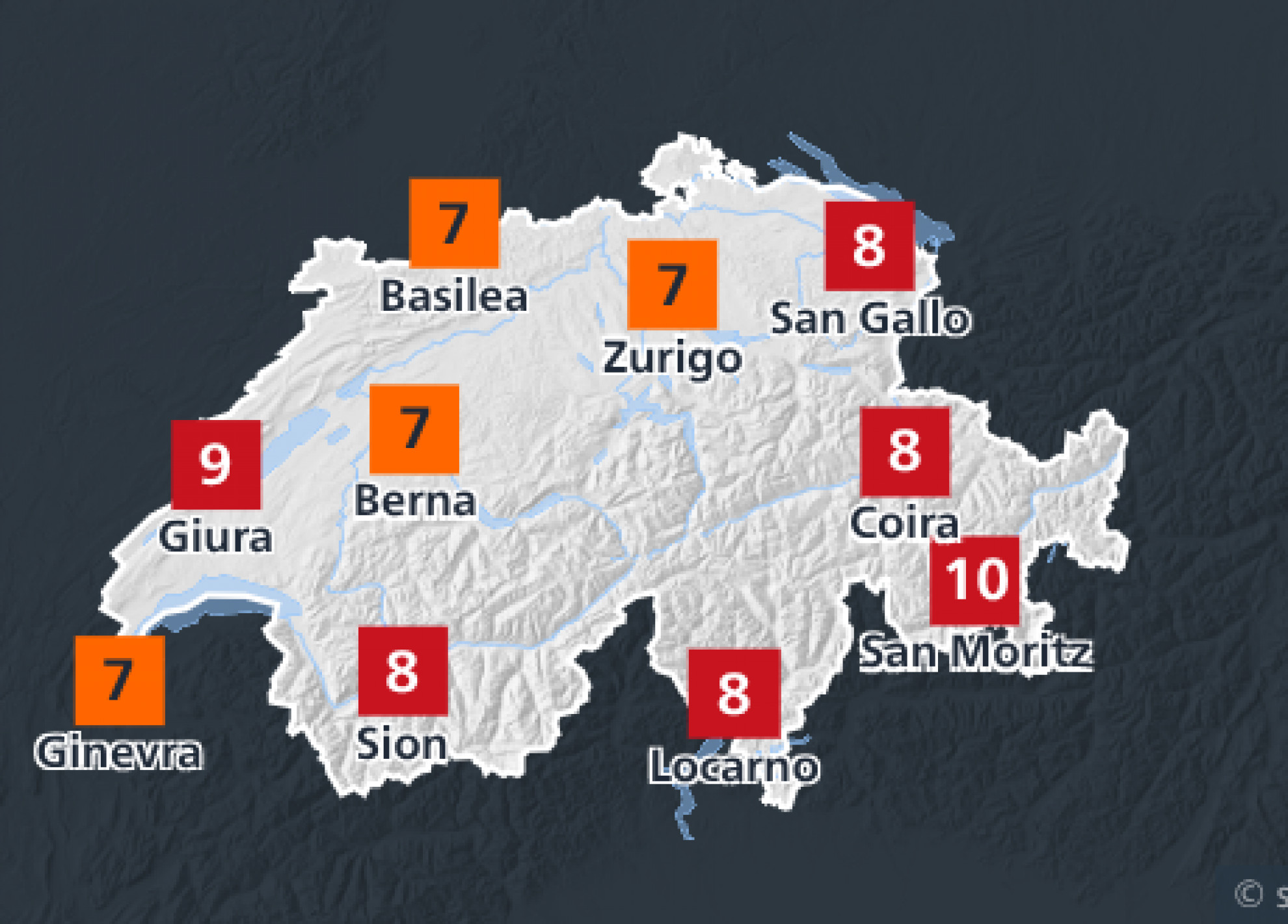 Per questo mercoledì, per esempio, su gran parte della Svizzera (e in Ticino) il livello è rosso (quindi molto alto) con un picco in quel di St. Moritz (10) e un sonoro 8 nel nostro cantone (per Lugano, invece, vale un 9).