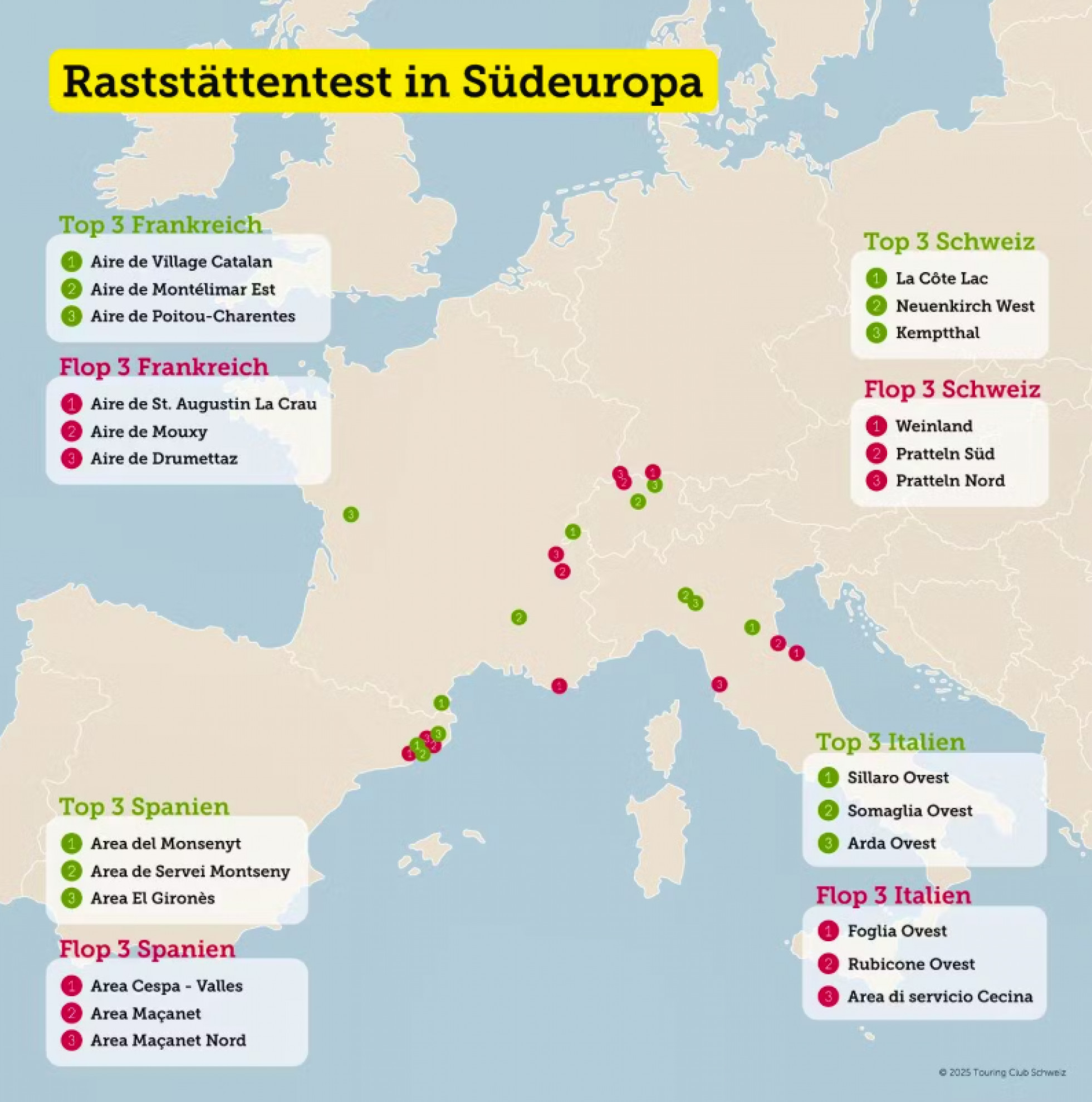 La situazione è ancora peggiore in Spagna: delle dieci aree di servizio testate, solo una ha raggiunto a malapena il 50%. «L'Area del Monseny sulla AP-7 ha raggiunto il 50% grazie a un'area cani, un parco giochi e una solida infrastruttura per camper», scrive il TCS. Le aree di Maçanet, Cespa-Valles (18% ciascuna) e Maçanet Nord (21%), al contrario, hanno ottenuto risultati particolarmente deludenti.