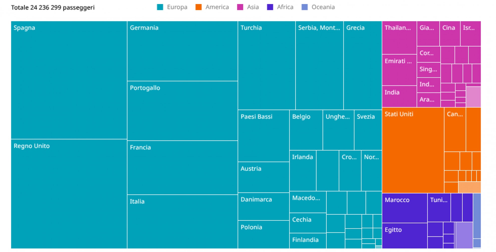 Sotto ai livelli pre-pandemia - Nel 2024, i flussi di passeggeri in viaggio verso l’Europa, l’Asia e l’Oceania erano ancora inferiori a quelli del 2019, l’ultimo anno precedente la pandemia di Covid-19, mentre l’Africa e l’America hanno registrano cifre più elevate. «Per questi Continenti - commenta l'UST - nel decennio precedente la crescita era stata relativamente debole. Dopo il 2010 l’Africa ha persino registrato un temporaneo calo: anzitutto dovuto a un crollo dei viaggi verso l’Egitto e la Tunisia, destinazioni prima molto popolari, sulla scia delle turbolenze politiche legate alla cosiddetta "primavera araba"».