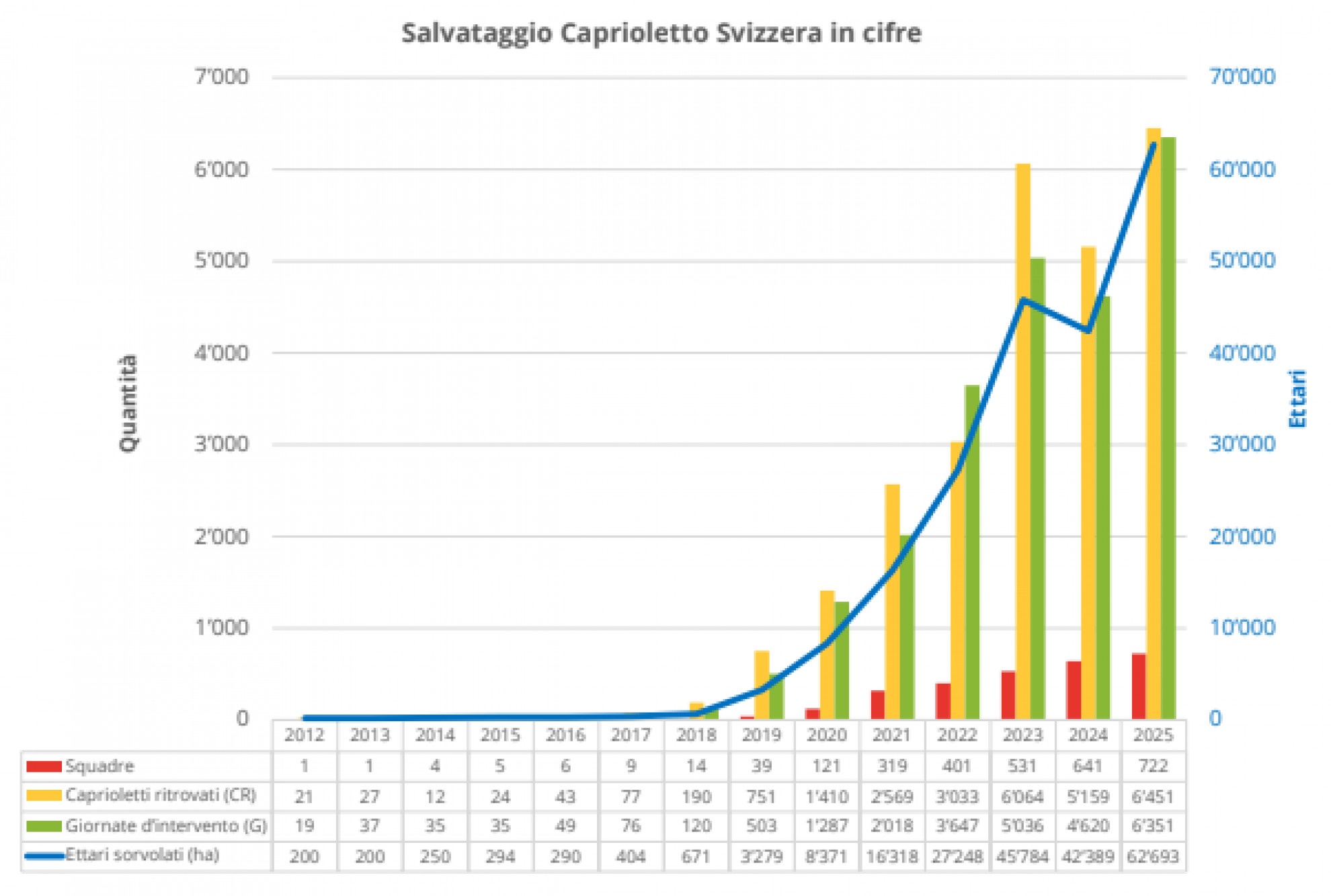 BERNA - La stagione principale per il salvataggio dei caprioli dura normalmente da fine aprile a inizio luglio. Nella stagione 2025 appena conclusa, la Salvataggio caprioletto Svizzera ha registrato cifre record in tutti i settori. Particolarmente soddisfacente è il fatto che siano stati salvati 6'451 piccoli, il che corrisponde addirittura a un leggero aumento rispetto alla precedente stagione record risalente al 2023.
