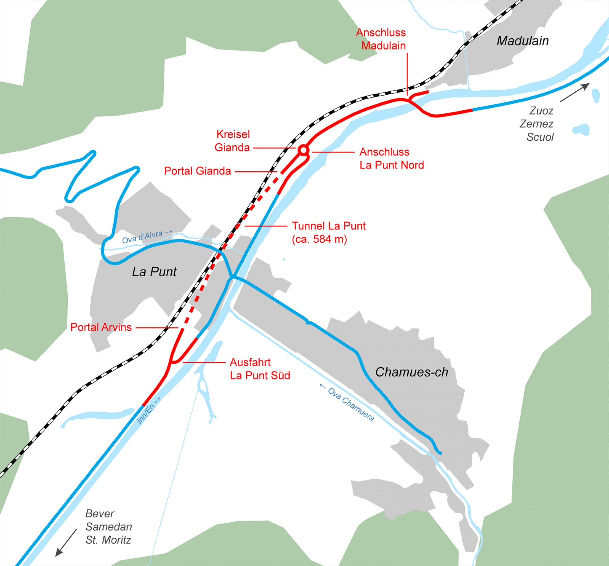 Attuazione a tappe fino all'apertura nel 2033 - L'intero progetto di circonvallazione è lungo 1,9 chilometri. Una galleria lunga 584 metri, il fulcro del progetto, passa sotto il centro del paese di La Punt Chamues-ch. I costi per la circonvallazione ammontano complessivamente a 80 milioni di franchi. I lavori sono suddivisi in diverse tappe e dureranno presumibilmente otto anni. Le aree di cantiere presso entrambi i portali della galleria saranno allestite ancora quest'anno. Nel 2026 sarà realizzata la trincea d'approccio in zona Arvins.
