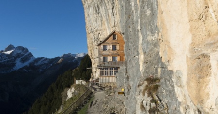 APPENZELLO - Questa è probabilmente la locanda più famosa della Svizzera: l'Äscher, a Weissbad (AI), in passato una semplice baita di montagna. La sua particolarità sta nel fatto che è "attaccata" a una vertiginosa parete rocciosa.