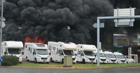 Le fiamme hanno interessato diversi camper di un rivenditore. Una grossa nuvola di fumo denso e acr...