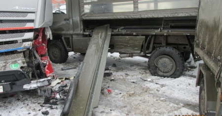 Il 19enne alla guida del Duro militare ha affrontato una curva, quando il veicolo è scivolato sulla neve, andandosi a schiantare contro la cabina del camion - guidato da un 54enne - che procedeva in maniera corretta.
