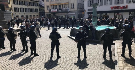 Malgrado ciò poco prima di mezzogiorno diversi manifestanti giunti alla spicciolata muniti di striscioni e cartelli si sono riuniti davanti alla statua di Guglielmo Tell. Gli agenti di polizia li hanno più volte invitati a lasciare la piazza, ma sono stati sommersi di fischi. Verso le 14.00 è poi apparso un corteo di persone vestite di nero e dal viso coperto: marciavano sulle note del "Requiem" di Mozart e brandivano cartelli con scritto "Piangiamo la libertà".
