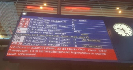 DÄNIKEN - Disagi sulla linea ferroviaria tra Aarau e Soletta: è successo ieri sera a causa di un falso allarme bomba su un treno IC Berna-Zurigo.