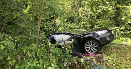 La vettura è quindi finita in una ancora più ripida scarpata, dove fortunatamente si è fermata contro un albero. Dietro quest'ultimo, il pendio proseguiva per sei metri quasi in verticale, finendo in un ruscello.