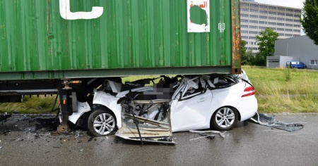 Frontale con un rimorchio posteggiato, nulla da fare per il conducente