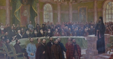 Il quadro raffigura una riunione dei principali rappresentanti ecclesiastici serbi di metà Ottocento, che aveva avuto luogo il 2 aprile 1861, nel corso della quale era stata discussa la creazione di una regione autonoma della Serbia. Il dipinto era stato sottratto nel 1993 dal castello di Čelarevo, città sul Danubio nella provincia autonoma serba della Voivodina.