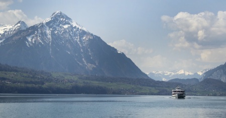 La montagna dell'Oberland bernese vista dal lago di Thun.