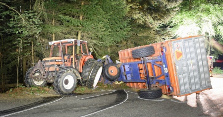 SCHOTZ - Sul trattore aveva deciso di fare salire anche un bambino di cinque anni ma all'imbocco di un tornante in leggera pendenza - all'uscita del paese di Schotz - il rimorchio carico di grano si è ribaltato finendo contro un albero.