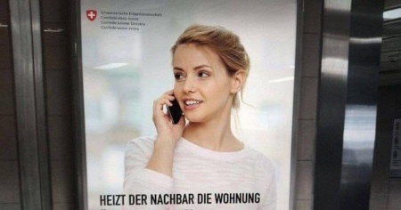 Con tanto di marchio della Confederazione, il falso manifesto mostra una giovane donna al telefono che dice, in tedesco: «Il vicino riscalda la sua casa a più di 19 gradi? Per favore, informateci». Viene anche promessa una ricompensa di 200 franchi agli informatori, che sono invitati a chiamare il numero di telefono del Dipartimento federale dell'ambiente, dei trasporti, dell'energia e delle comunicazioni (DATEC), indicato sul manifesto.
