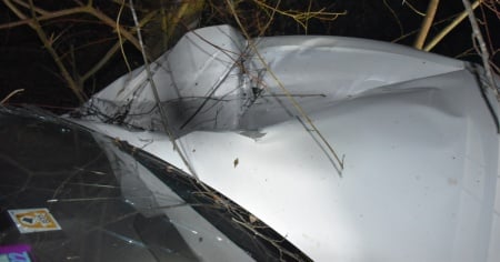 Il botto (e probabilmente anche lo spavento) e l'auto ha sbandato, attraversando la corsia opposta ed uscendo di strada per andare a fermarsi su un terrapieno in pendenza.