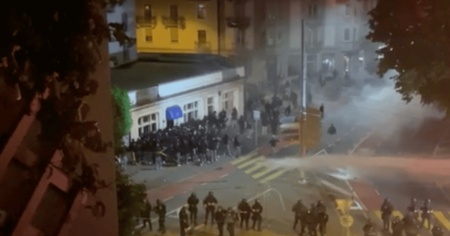Quattro persone sono rimaste ferite. Gli agenti sono stati presi di mira con petardi, bengala, bottiglie e pietre.
