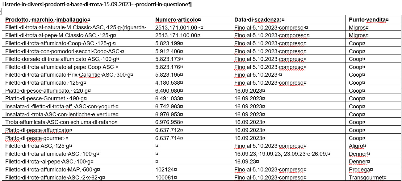 BERNA - È stata riscontrata la presenza di listerie in filetti di trota. Lo rende noto l'ʼUfficio federale della sicurezza alimentare e di veterinaria (USAV) dopo aver eseguito un controllo interno del fornitore danese Agustson A/S che ha immediatamente ritirato i prodotti interessati dalla vendita e ha avviato un richiamo.