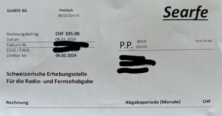ZURIGO - 335 franchi di canone radiotelevisivo da pagare via fattura su richiesta della Searfe. Sì, non è un refuso, ma bensì una truffa.