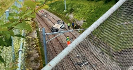 Auto giù da un ponte finisce sulla ferrovia: travolta da un treno