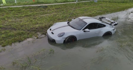 Una sbandata e la Porsche finisce a mollo fra i campi allagati