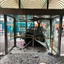 Il veicolo ha finito la sua corsa contro la porta girevole. Ingenti i danni.