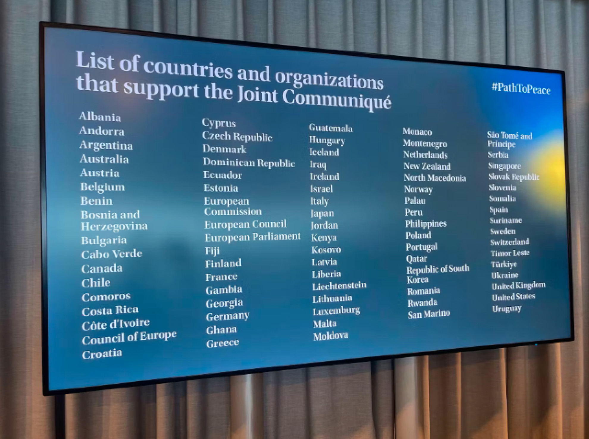 «Crediamo che il raggiungimento della pace richieda il coinvolgimento e il dialogo tra tutte le parti. Abbiamo quindi deciso di intraprendere passi concreti in futuro nelle aree sopra menzionate con un ulteriore impegno dei rappresentanti di tutte le parti. La Carta delle Nazioni Unite, compresi i principi del rispetto dell'integrità territoriale e della sovranità di tutti gli Stati, può e servirà come base per raggiungere una pace globale, giusta e duratura in Ucraina».