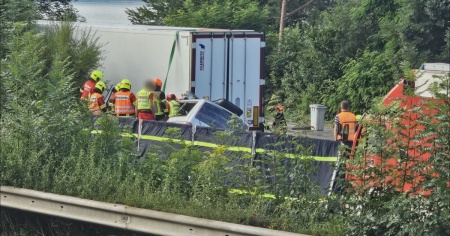 Un veicolo con targa tedesca è uscito di strada. Si è scontrato con uno spartitraffico, è sceso lungo una scarpata e si è schiantato frontalmente contro un camion parcheggiato nella piazzola di sosta. Una persona è rimasta gravemente ferita, tanto da morire sul posto.