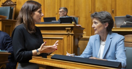 Flavia Wasserfallen parla con Simonetta Sommaruga, a Palazzo Federale.