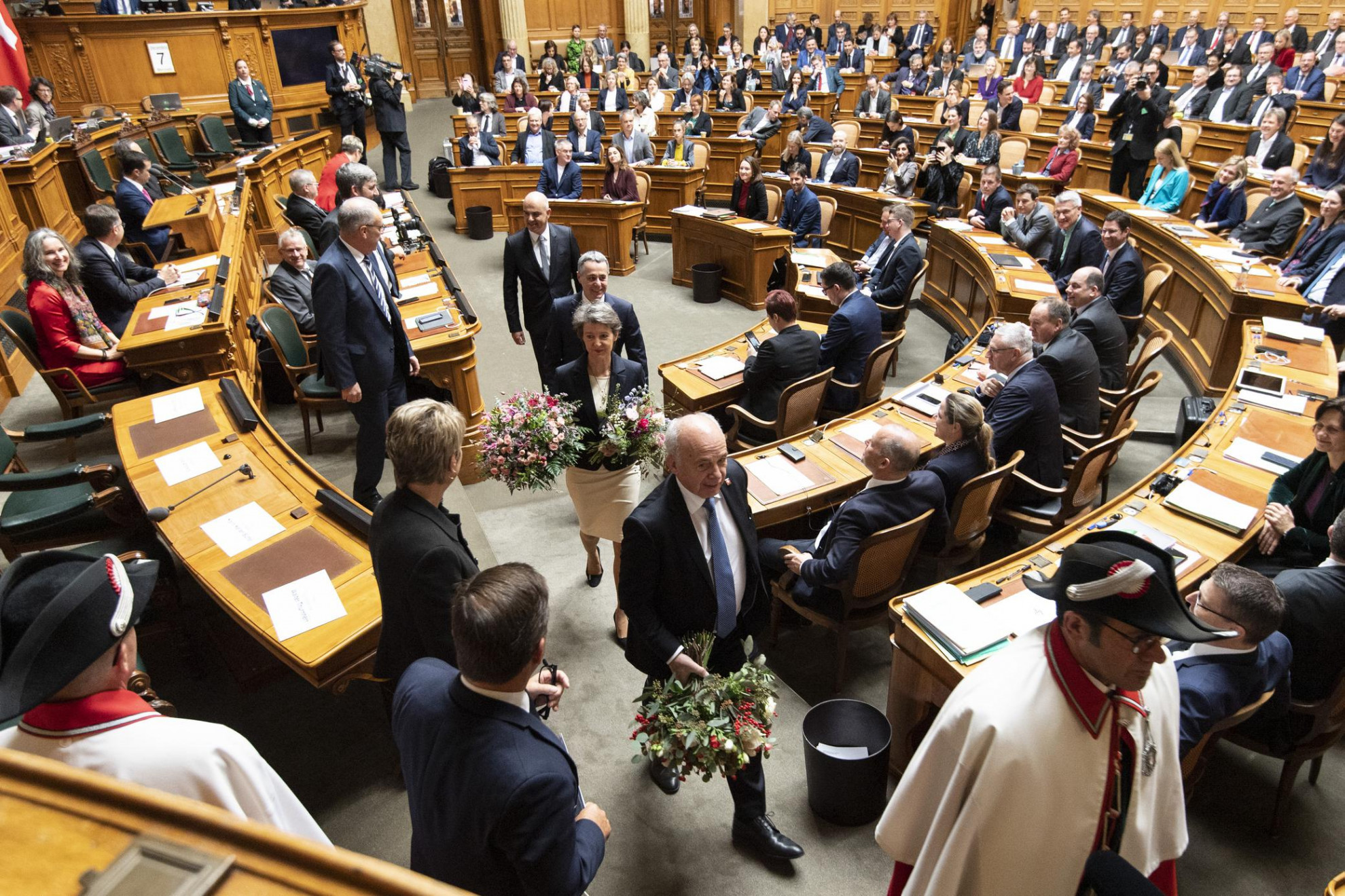 In aula vengono distribuite le schede (245) per il primo turno. Come funziona l'elezione? Per ogni elezione, i primi due turni sono liberi. Chi racimola meno di dieci voti al secondo turno viene eliminato. Questa regola si applica anche per i turni seguenti. A partire dal terzo turno non sono più accettate nuove candidature; chi ottiene meno voti è eliminato. Quando rimangono in lizza due pretendenti, in caso di parità di voti l'elezione prosegue finché uno dei due non la spunta.