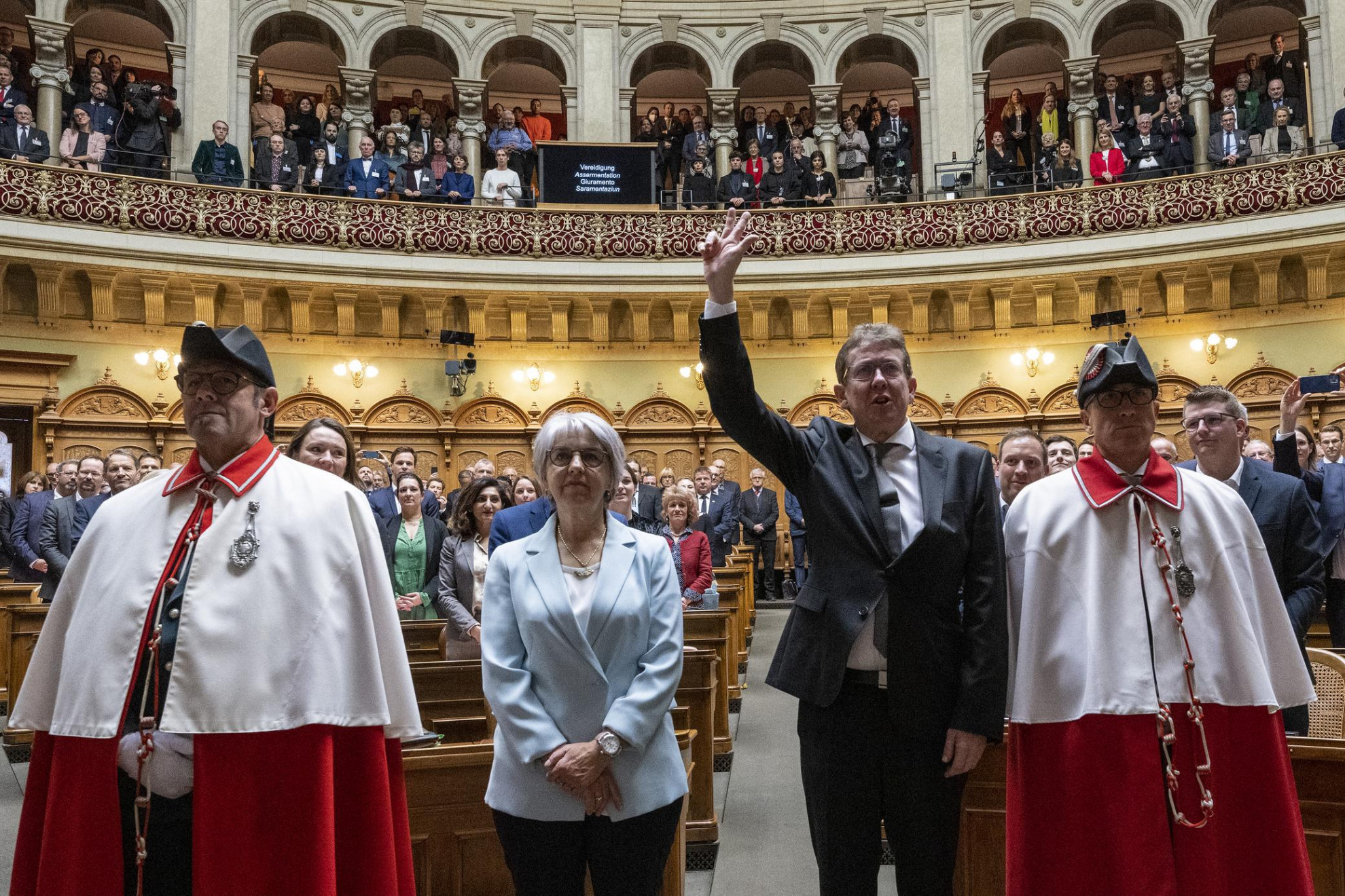 I neo consiglieri federali Albert Rösti (BE) e Elisabeth Baume-Schneider (JU) hanno prestato giuramento oggi alle 10.35. Rösti ha dichiarato «lo giuro» alzando tre dita della mano destra, Baume-Schneider ha detto «lo prometto» mettendo la mano sul cuore.