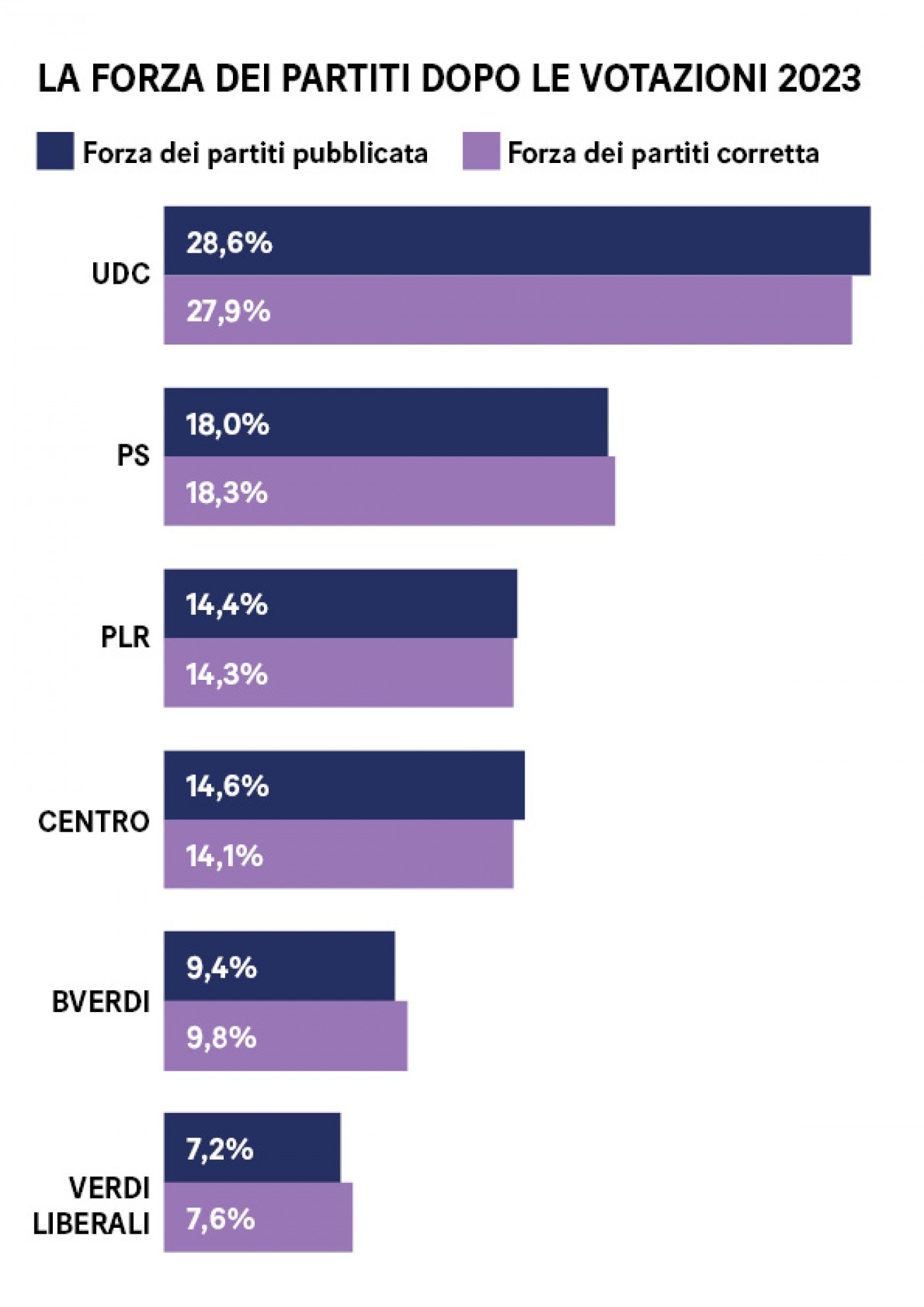 I nuovi (e reali) rapporti di forza dei partiti, in seguito alla correzione dati sbagliati diffusi dalla Confederazione.