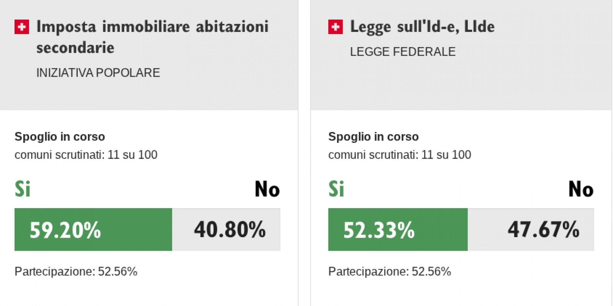 Alla fine dalle urne federali sono usciti due "sì". Ma lo svolgimento nel corso della giornata è stato molto diverso. Se da una parte l'approvazione dell'abolizione del valore locativo non è mai stata in discussione, dall'altra la Legge sull'ID-E ha subito un vero e proprio ribaltone con il voto di Zurigo. Con il "no" che si è trasformato in un (risicatissimo) sì.