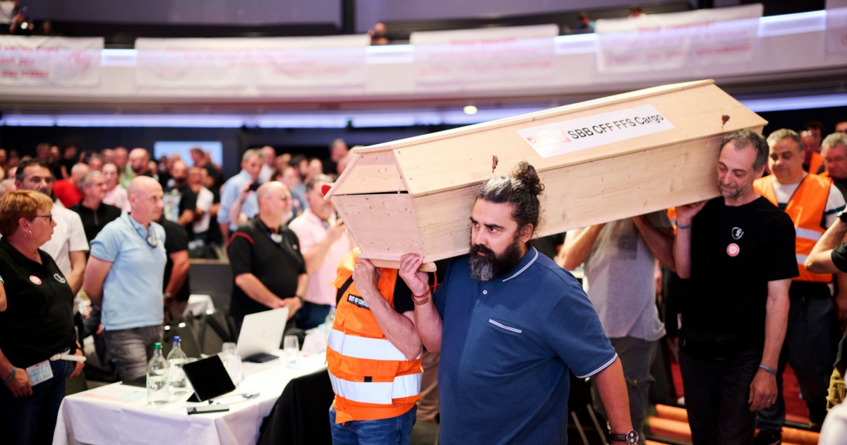 Una bara di FFS Cargo per dire: «Non vogliamo la sua fine»