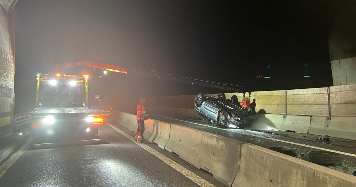 Auto ticinese urta lo spartitraffico e si rovescia sul tetto