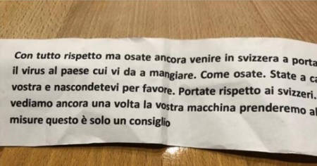 LOCARNO - «Con tutto rispetto, ma osate ancora venire in Svizzera a portarci il virus, nel Paese che vi dà da mangiare? Come osate? State a casa vostra e nascondetevi, per favore. Portate rispetto agli svizzeri. Se vediamo ancora una volta la vostra macchina, prenderemo altre misure. Questo è solo un consiglio». È il testo di un biglietto colmo di ignoranza trovato nel Locarnese sul parabrezza di un’auto con targhe italiane da un albergatore asconese. L’uomo ha subito segnalato il fatto alla Polizia Comunale.